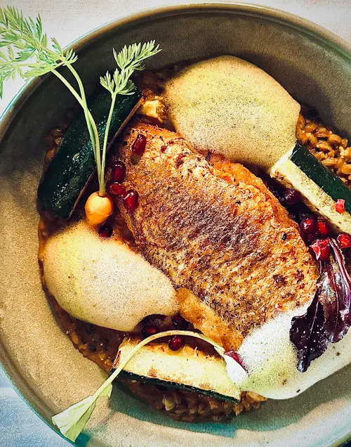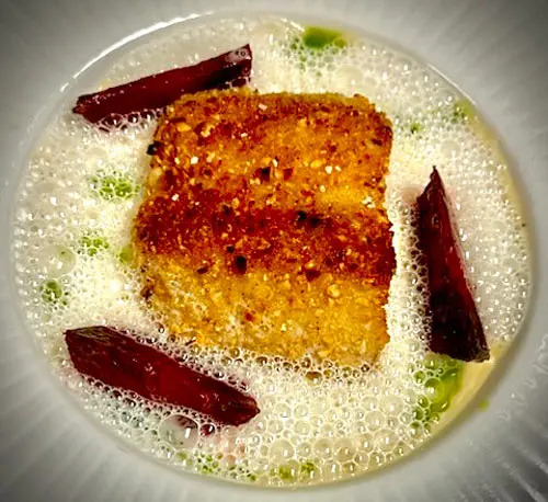 Baked Beet Composition Whipped Goat Cheese • Truffle Air• Compressed Watermelon Blood Orange• Balsamic Caviar• Thai Basil Paired with: Vermentino – IS Argiolas, Sardinia, 2024 Earth and energy in balance. Roasted beet and creamy chevre provide structure; citrus and basil deliver lift. Balsamic pearls punctuate the plate with focused bursts of acidity- controlled power, refined finish.